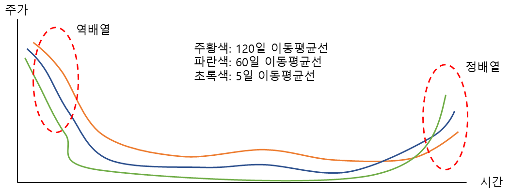 가. 정배열: 차트에서 이동평균선이 위에서부터 단기 이동평균선 > 중기 이동평균선 > 장기 이동평균선의 순서대로 배치된 상태를 뜻합니다. 주가의 상승 추세에서는 이동평균선이 정배열 상태로 나타납니다.