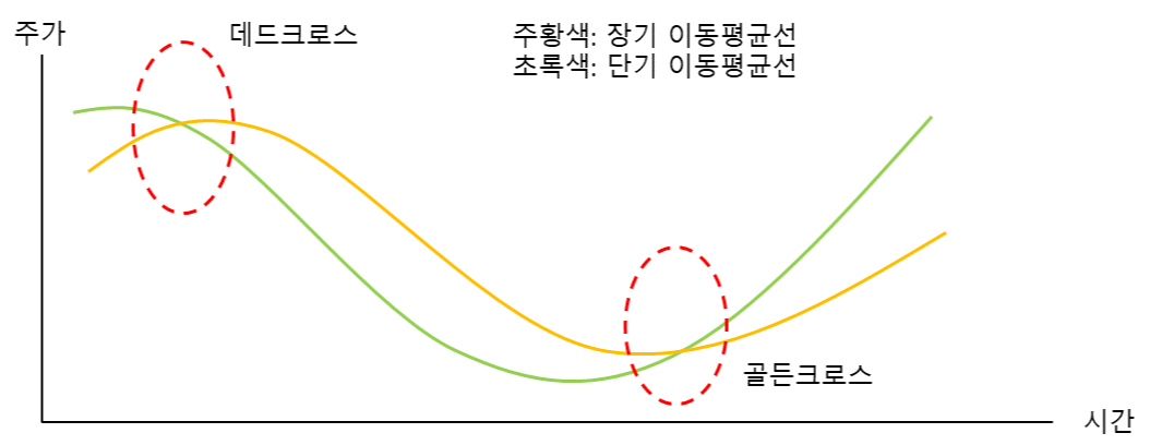 주가가 흐름을 만들어 가면서 이동평균선이 서로 교차를 하는 경우에는 골든크로스와 데드크로스의 두 가지가 있습니다.